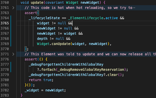 3769 라인의 canUpdate는 static 메소드로 새로운 위젯과 이전 위젯의 runtimeType과 key를 비교합니다.