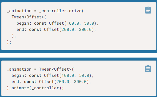 _controller가 AnimationController 라고 가정하고 우리는 controller에 의해 제어되는 Animation<Offset> 를 생성할 것 입니다. 그리고 그 값을 _animation에 저장합니다. 위의 예를 아래와 같이 2가지 방법으로 표현 할 수 있습니다.