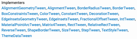 또한 적절한 +, - 및 * 연산자를 가진 일부 타입들에는 보다 전문적인 방법으로 보간을 수행하는 전용 Tween 서브 클래스들이 있습니다. 대표적인 예가 MaterialPointArcTween 클래스입니다. AlignmentTween, and AlignmentGeometryTween, and FractionalOffsetTween 들이 단지 연산자들에 의존하기보다 전용 lerp 메소드를 사용하는 Tweens의 또 다른 그룹입니다. (이런 방식은 null 값을 더 나은 방식으로 다룰 수 있게 해줍니다.)